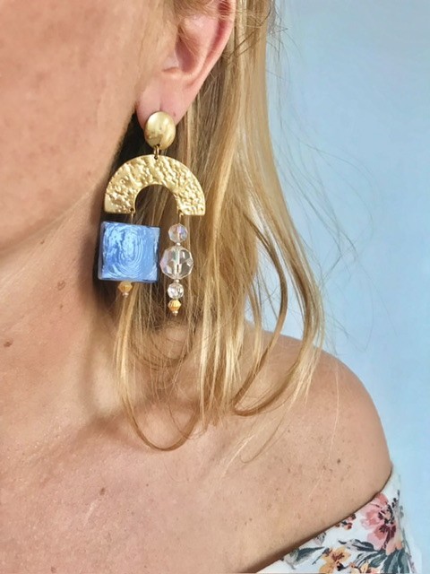 - Pampille demi lune dorée - perle bleue et perles Swarovski , recyclées