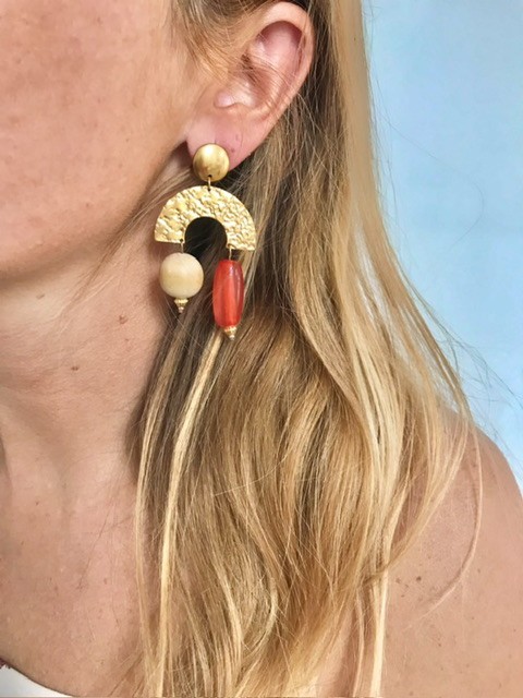 - Pampille demi lune dorée - perle grenadine et perle bois , recyclées