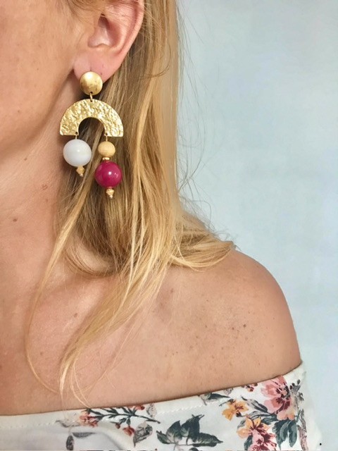- Pampille demi lune dorée - perle blanche, grenadine et perle en bois , recyclées