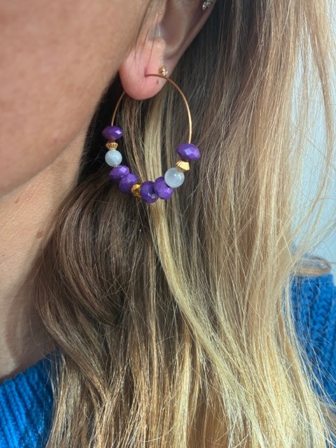 Ces créoles sont ornées de perles violettes évoquant le calme et le bien-être.